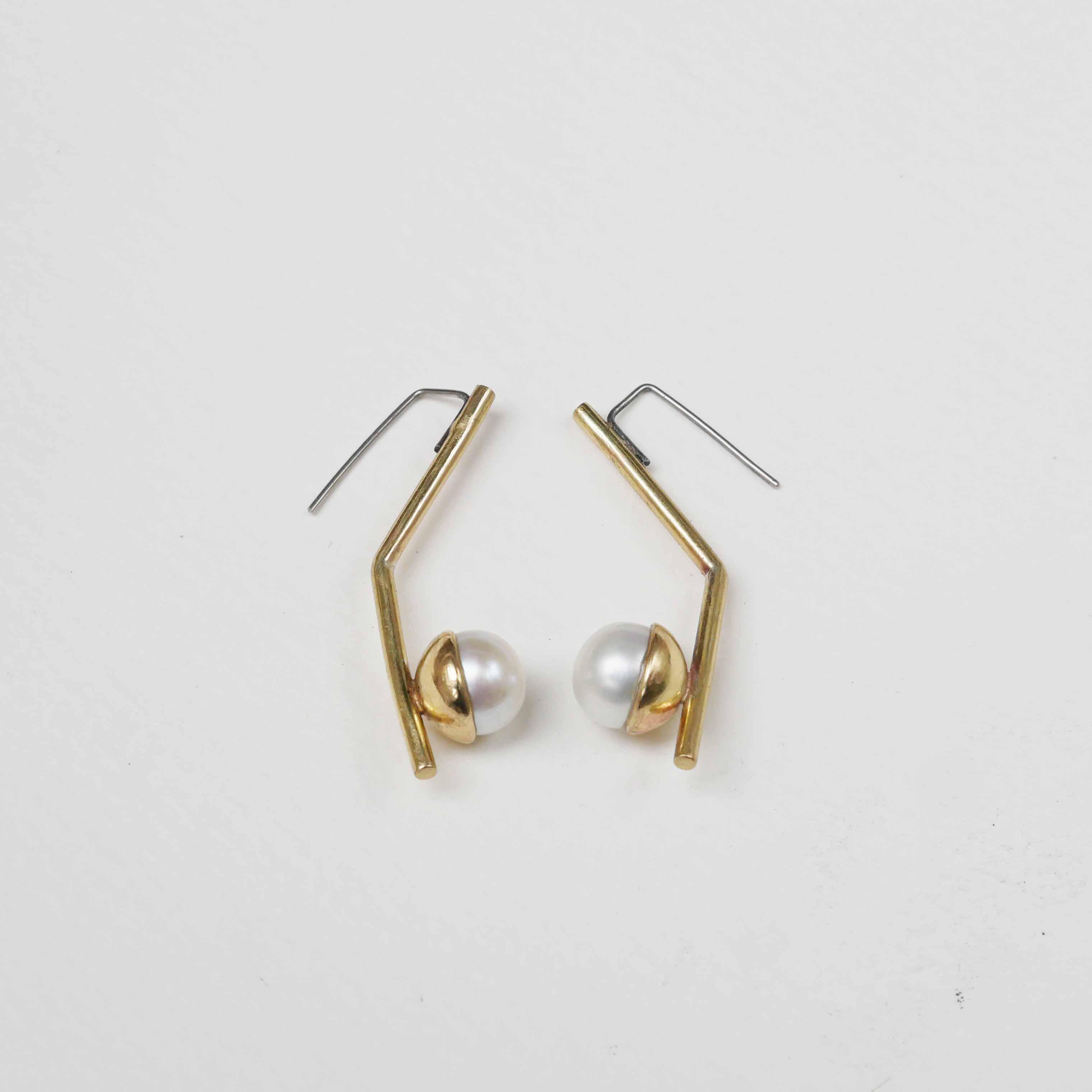 Designové minimalistické geometrické náušnice PERLA z leštěné mosazi s říční perlou. Mosaz je ošetřená proti patinování. Náušnice jsou pozlacené 24k zlatem. Háčky jsou z chirurgické oceli. Perla má průměr 9 mm, delka náušnice 4 cm.