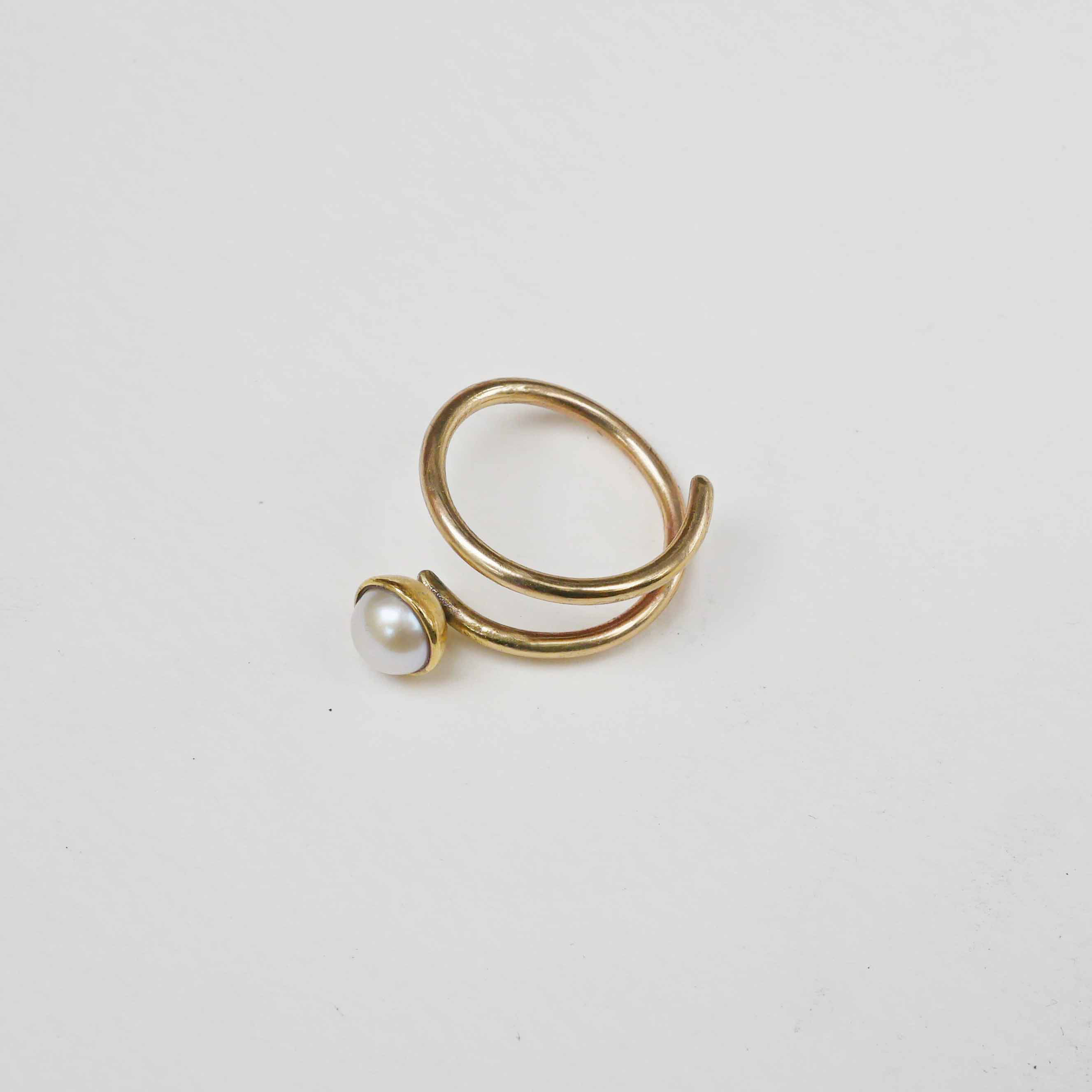 Designový minimalistický prsten PERLA z leštěné mosazi s říční perlou. Mosaz je ošetřená proti patinování. Háčky jsou z chirurgické oceli. Perla má průměr 9 mm.