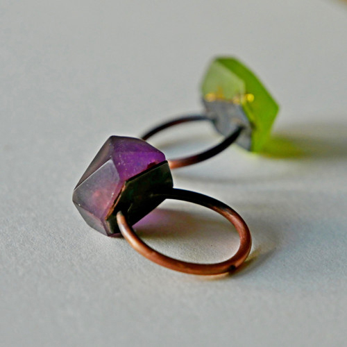 Designový prsten KÁMEN s tajemným barevným kamenem z barvené pryskyřice a mědi. Z barvy vyplovají k povrchu zlaté kousky. Přyskyřice je lehce průsvitná. Měď je lehce patinovaná. Kámen je ručně odlévaný, leštěný, se zlatými detaily.