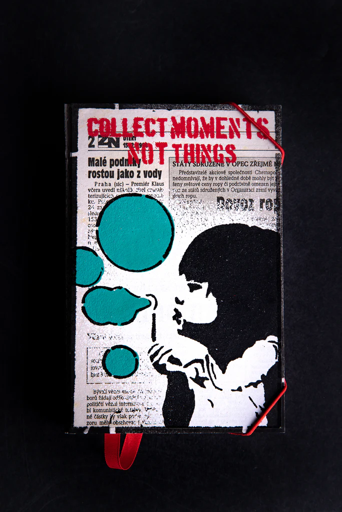 Originální dívčí zápisník BUBBLE GIRL má přes šablonu za pomoci sprejů ručně nastříkán originální design Dívka s bublifukem - Collect moments not things. Deafmessanger notebook velikosti A6 (12 x 17,5 cm) je vyroben z recyklovaného papíru. Uvnitř najdeš tužku na psaní a mezi listy bloku tě možná překvapí vložené staré fotografie, pohlednice, stránky z knížek a časopisů, či použité lístky na tramvaj. Každý kus je originál. Fotky z "interiéru" bloku neodpovídají jeho skutečnému obsahu. Nechte se mile překvapit :-) a pozorně si zápisník prohlédněte ať vám nic neuteče. Proti otevírání jsou desky zajištěny gumičkou.