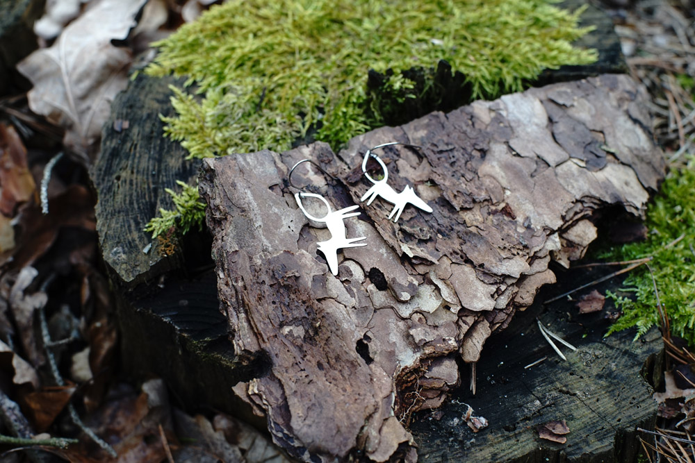 Designové visací náušnice Liška značky INTIMITY od autorky Lucie Zemanové jsou vyrobené z broušeného nerezu. Náušnice doplněny kovovými nebo plastovými zarážkami. Rozměry: 37 mm x 23 mm, tloušťka 1 mm.