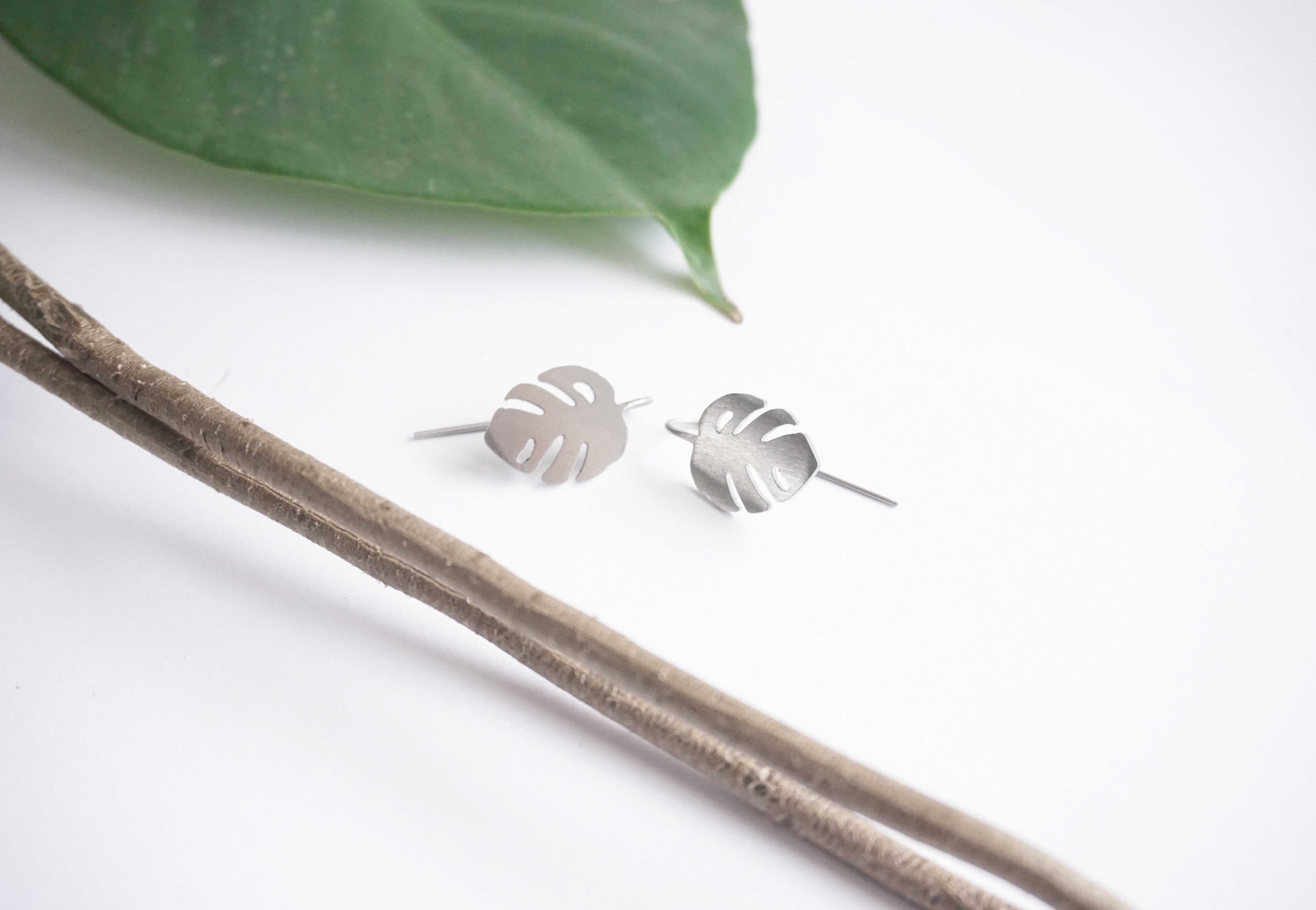 Designové malé náušnice Monstera značky INTIMITY od autorky Lucie Zemanové jsou vyrobené z broušeného nerezu. Náušnice doplněny kovovými nebo plastovými zarážkami. Rozměry: 12 x 6 mm. Cena 390 Kč.