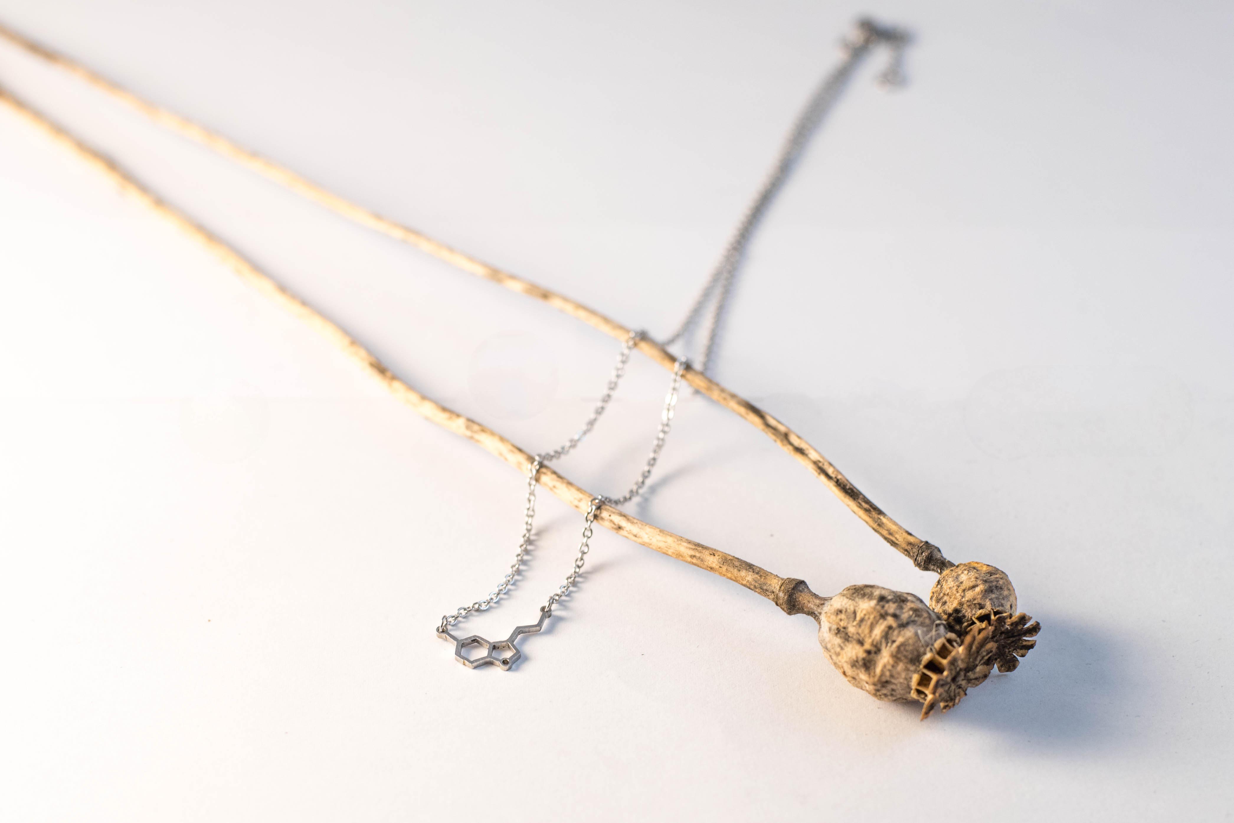 Designový řetízek Serotonin - hormon štěstí a radosti značky INTIMITY od autorky Lucie Zemanové je vyrobený z broušené nerezové oceli. Velikost přívěšku 20 x 10 mm. Délka řetízku 43 - 47 cm. Ukončen pomocí zapínání na karabinku.