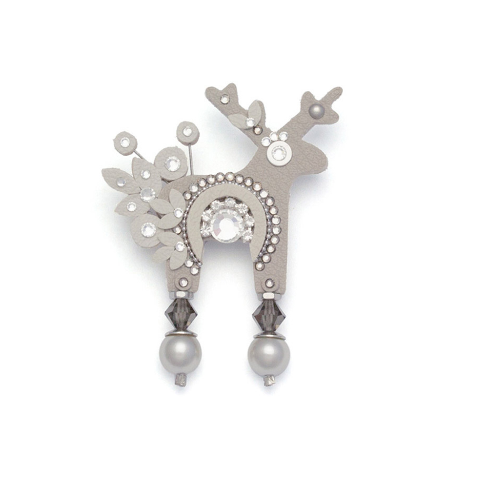 Brož jelínek Shadee je sice malý vzrůstem (3,5 x 4 cm), skrývá v sobě však řadu propracovaných detailů, které objevíte až po jeho důkladném prozkoumání. Jsou to třeba řasy z čirých krystalů, zdobení na parůžku nebo třpytivý štrasový řetízek ukrytý mezi středovým kamenem a pruhem koženky s pěnovkou. Jelínek Shade se vyšňořil tak, aby se hodil na slavnostní příležitosti i každodenní nošení. Nemusíte se tedy bát, že by vám snad dlouho pospával ve skříni.