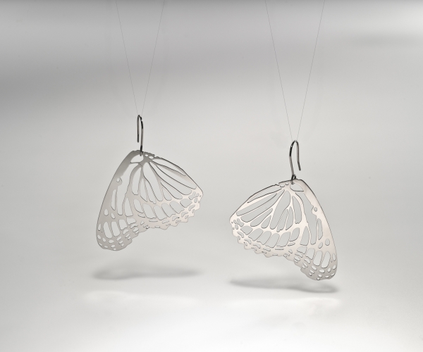 Designové motýlí náušnice Bělásek z Kolekce Naturalia jsou vyrobené z 0,3 mm plechu nerezové oceli. Dva páry křídel visí na jednom náušnicovém háčku z chirurgické oceli. Motýlí náušnice je levá a pravá. Ke každému páru náušnic dodáváme plastové puzetky poloprůhledné barvy ve tvaru válečku. Velikost náušnice 4 x 2,5 cm velikost puzetky 0,5 x 0,25 mm.