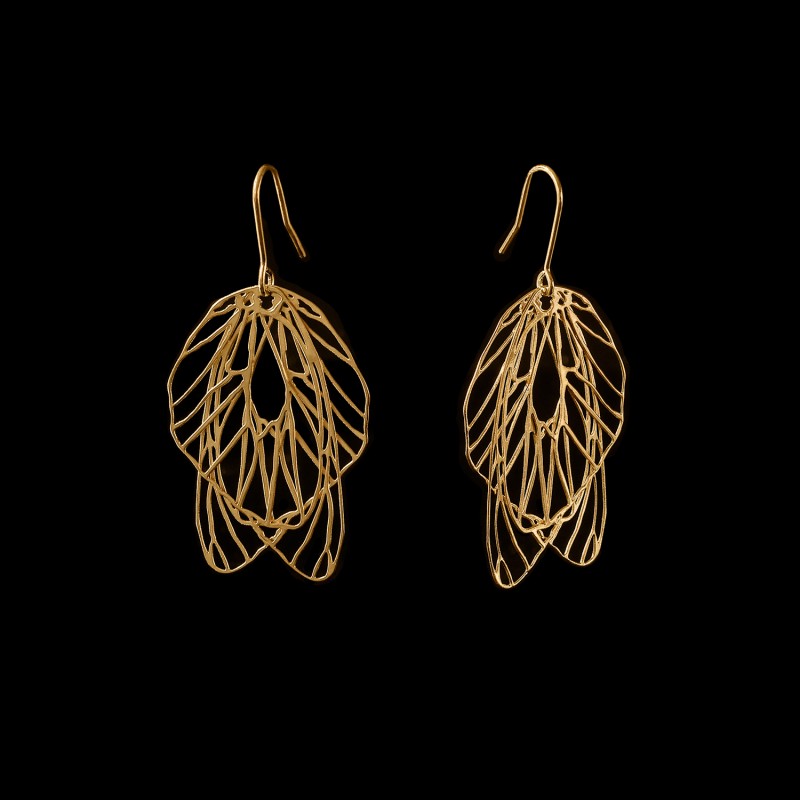 Designové motýlí náušnice Bělásek pozlacené z Kolekce Naturalia jsou vyrobené z 0,3 mm plechu nerezové oceli. Dva páry křídel visí na jednom náušnicovém háčku z chirurgické oceli. Motýlí náušnice je levá a pravá. Náušnice jsou galvanicky pozlacené. Ke každému páru náušnic dodáváme plastové puzetky poloprůhledné barvy ve tvaru válečku. Velikost náušnice 4 x 2,5 cm, velikost puzetky: 0,5 x 0,25 mm.