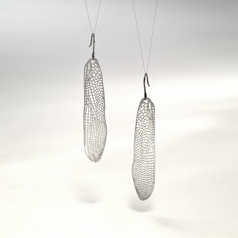 Designové náušnice Vážka jedno křídlo nerez z Kolekce Naturalia jsou vyrobené z 0,3 mm plechu nerezové oceli. Křídlo je zavěšeno na náušnicovém háčku z chirurgické oceli. Náušnice je levá a pravá. Ke každému páru náušnic dodáváme plastové puzetky poloprůhledné barvy ve tvaru válečku. Velikost náušnice 6,5 x 1,2 cm, velikost puzetky 0,5 x 0,25 mm.