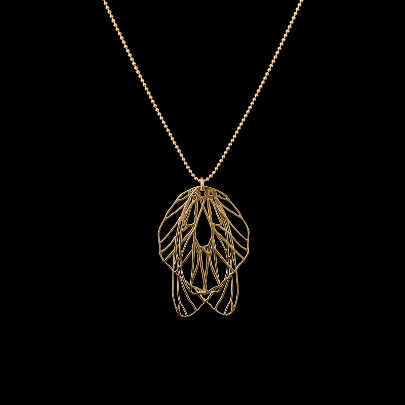 Řetízek Bělásek pozlacený z Kolekce Naturalia je vyroben z 0,3 mm plechu nerezové oceli. Subtilní kuličkový řetízek prochází kroužkem z chirurgické oceli, na kterém visí dvě křídla běláska a tvoří ornament. Kuličky řetízku mají průměr 1 mm. Přívěsek a řetízek jsou galvanicky pozlacené, velikost přívěsku 4 x 2,5 cm, délka řetízku 50, 75, 80 cm.