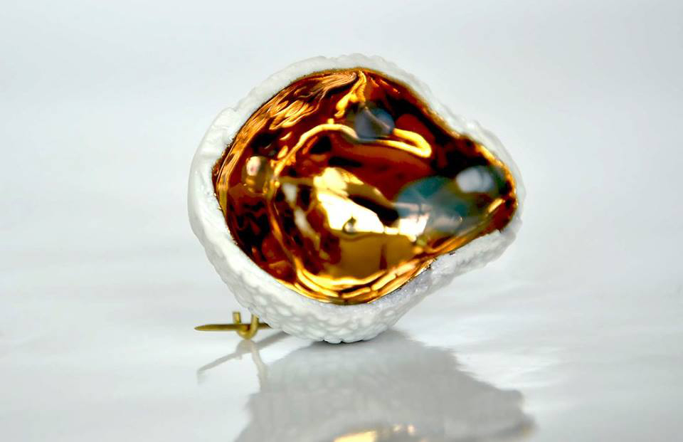 Porcelánové šperky z kolekce FLORA - Marcula, Liči, Avokádo, Kokos, odlévané z bílého porcelánu, často v kombinaci se zlatem nebo platinou. Autorkou porcelánových šperků je designérka Pavla Vachunová.