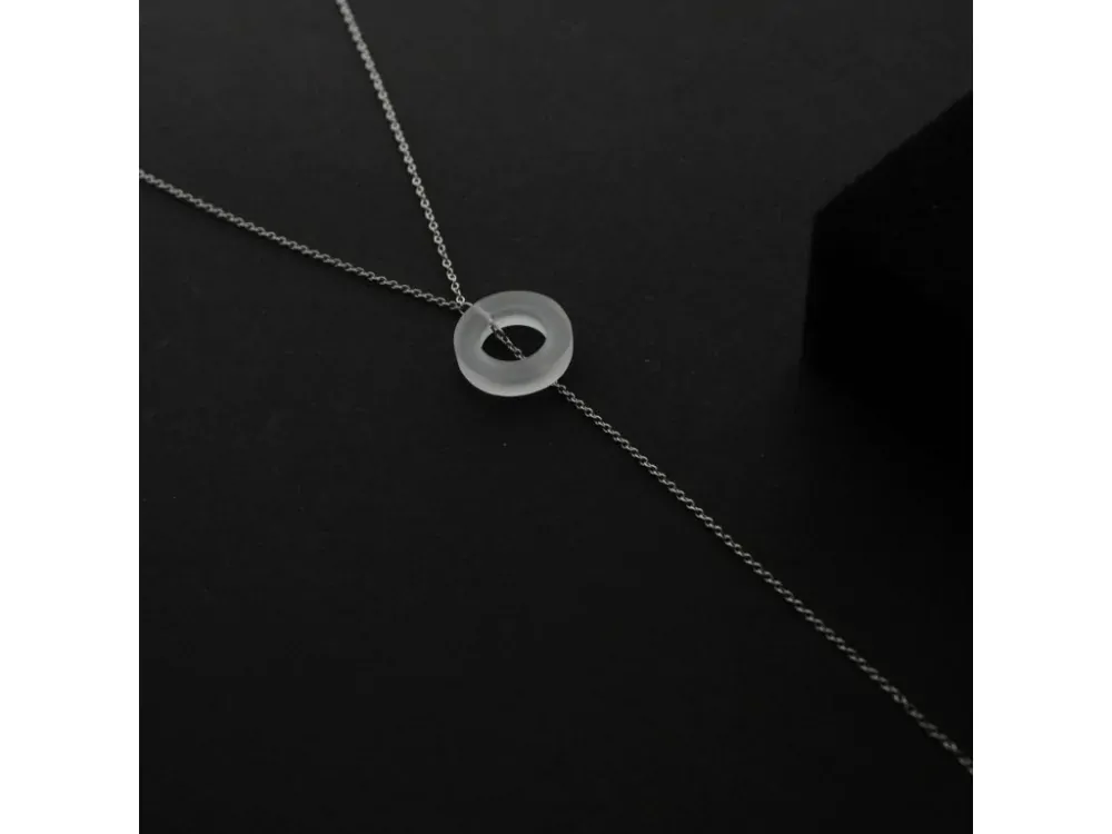 Dlouhý elegantní náhrdelník AQUA XVI od yo_soy je tvořený řetízkem z nerezové oceli, na něm je zavěšený menší kroužek z matně průsvitného akrylátového skla a další splývající řetízek. Řetízek z nerezové oceli má obvod 80 cm + 12 cm splývající řetízek, kroužek z akrylátového skla má průměr 2,2 cm.