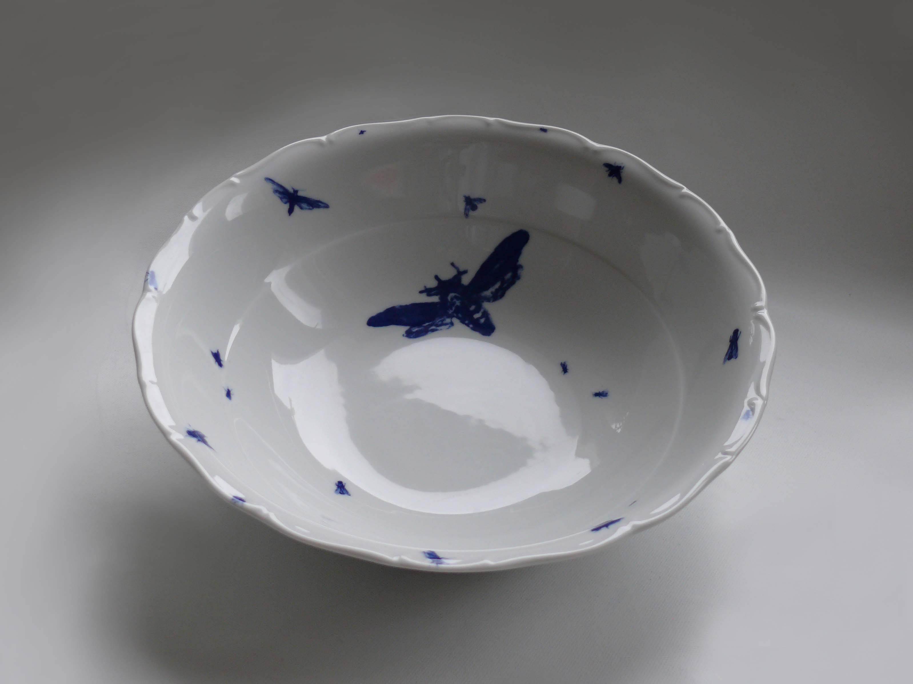Autorská salátová porcelánová mísa TEMPORE MORTUUS. Kobaltový dekor pod glazurou. Lze mýt v myčce. Rozměr: ø 26,5 cm. Hmyzí mísa – skvělý a originální designový dárek pro vaše blízké.