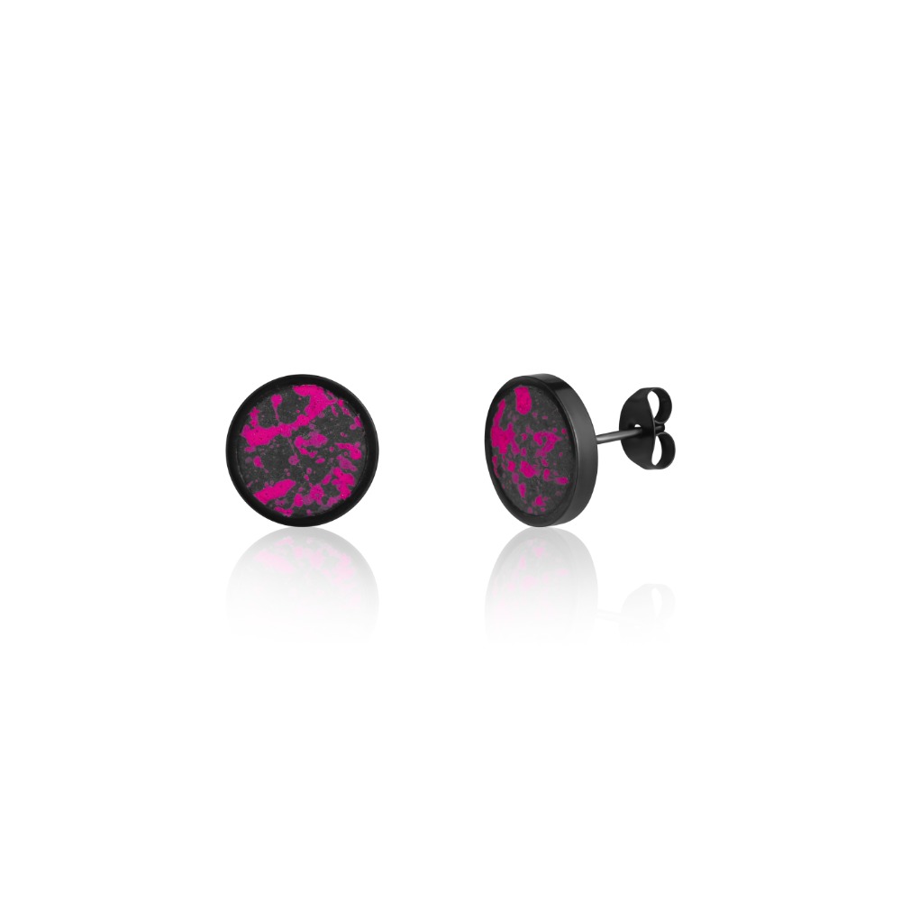 Originální betónové náušnice růžové Betonbeads, ve 3 velikostech lůžka 10, 12 a 14 mm, v černém designu, které tvoří tmavěšedý beton s růžovým stříkáním, jsou vyráběné ze speciálního šperkařského betonu a nerezového lůžka, jsou povrchově impregnované a tudíž odolné proti vodě.