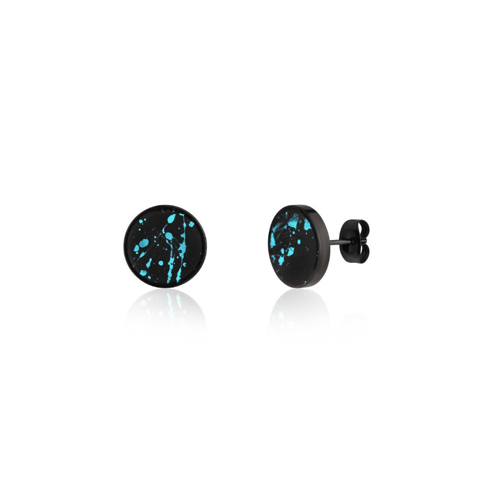 Originální betonové náušnice tyrkysové Betonbeads, ve 3 velikostech lůžka 10, 12 a 14 mm, v černém designu, které tvoří tmavěšedý beton s tyrkysovým stříkáním, jsou vyráběné ze speciálního šperkařského betonu a nerezového lůžka, jsou povrchově impregnované a tudíž odolné proti vodě.