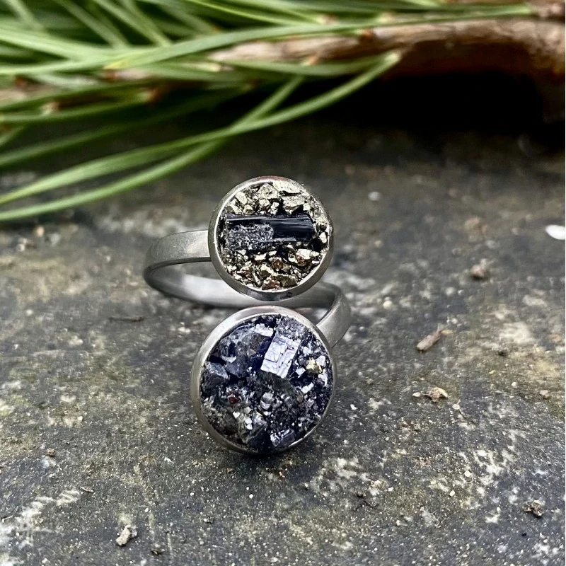 Originální dvojitý designový betónový prsten je vytvořen z nerezového lůžka a kamenů, fixován betonem. Surové polodrahokamy křištál, malachit, růženín, pyrith, struska..., chirurgická ocel, beton...každý kus trochu jiný, originalita zcela zaručena. Velikost prstenu se přispůsobuje prstu.