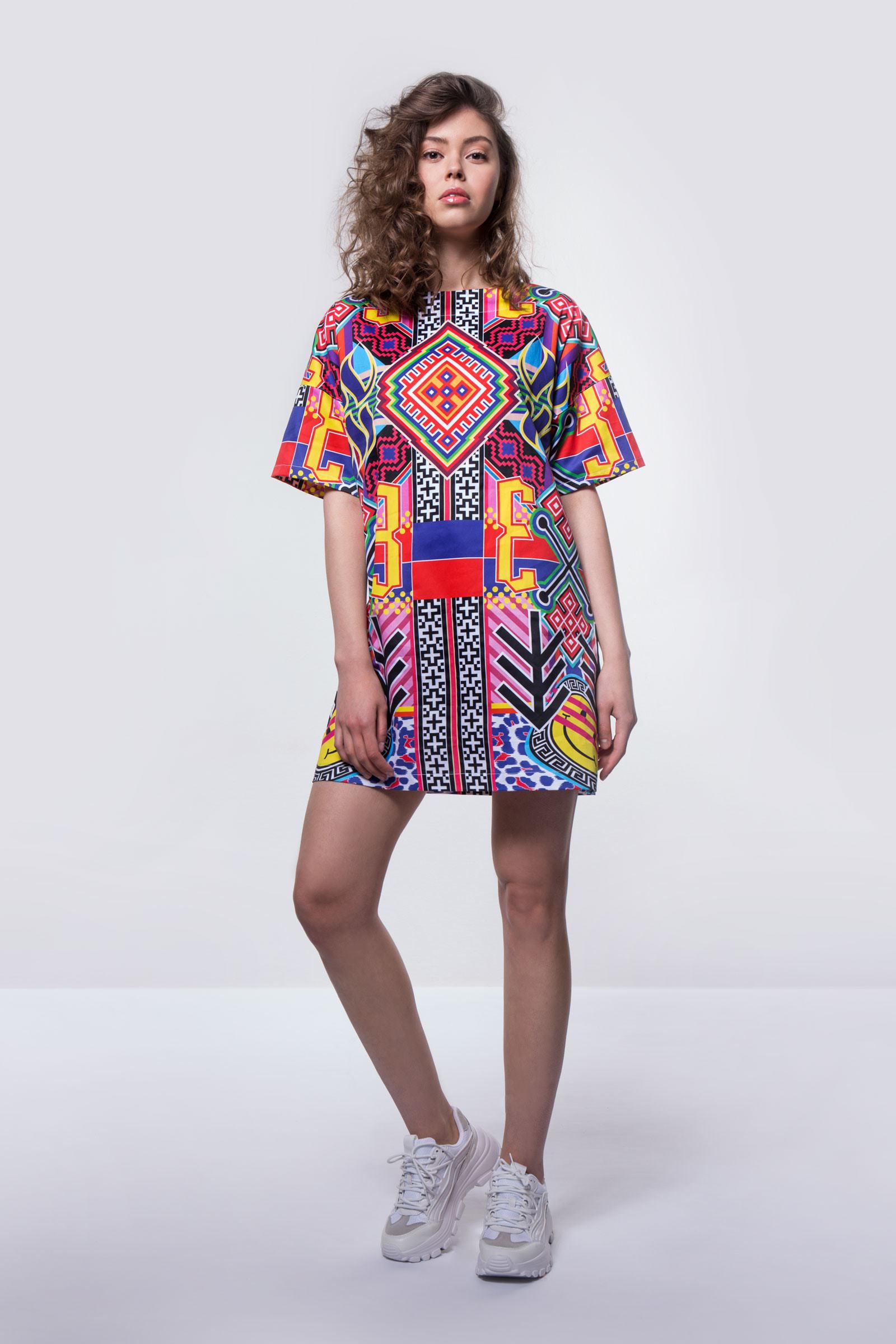 Šaty “Angels 33” ze stejnojmenné kolekce, jsou mixem orientální kaligrafie s ornamenty a symboly východní Evropy, Jižní Ameriky a západní Afriky. V kombinaci “Smiley faces” a andělského znamení 33, mají šaty sílu talismanu, který nejde přehlédnout na rozkvetlé jarní louce ani rozpálené letní avenue! Šaty jsou zpracované ve volném a pohodlném t-shirt dress střihu z velice příjemné látky s