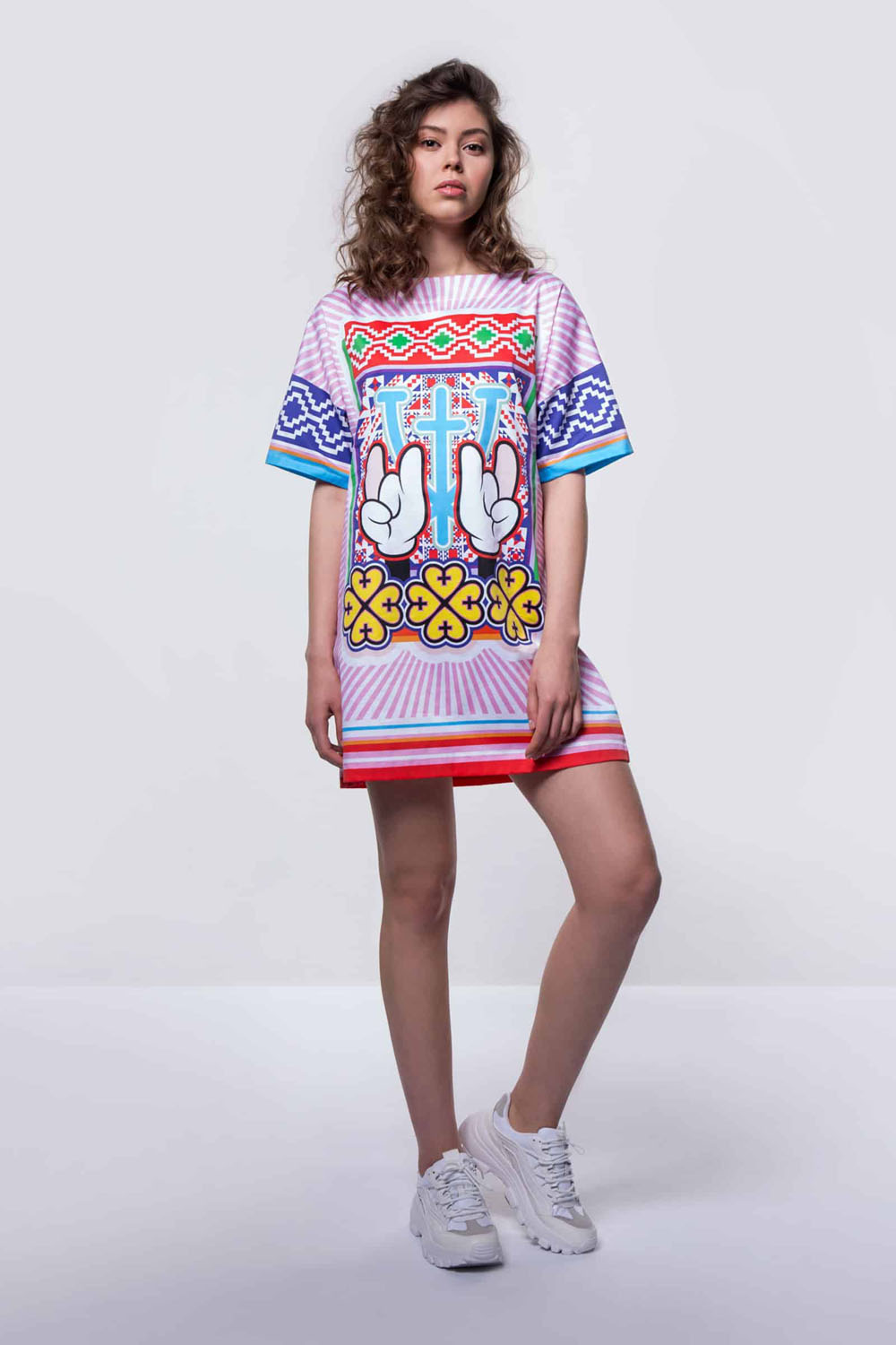 Šaty “Warriors” z kolekce “Angels 33”, jsou jako vizuální štít.Svým znamením proti uhranutí à la “Disney rock on”, mixnutým folklorními symboly několika kontinentů, magicky odpálí každou možnost vašeho oslabení! Šaty jsou zpracované ve volném a pohodlném t-shirt dress střihu z velice příjemné látky s hedvábnou měkkostí.