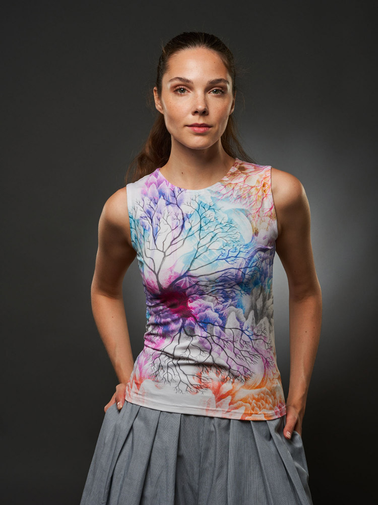 Úpletový top jednoduchého střihu s výstřihem do tvaru slzy na zadním díle. Látka je potištěna motivem vnitřní krajiny z kolekce Můry od české ilustrátorky Spradky. Umístění vzoru je na každém kusu jiné v závislosti na rozložení střihu.