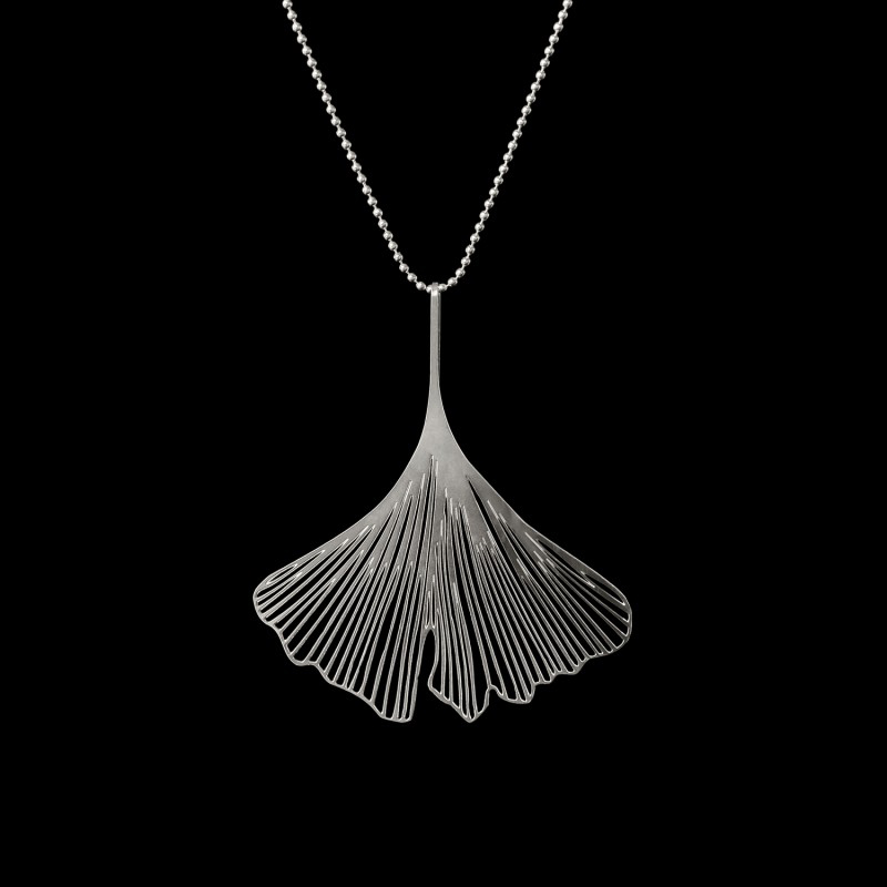 Řetízek Ginkgo nerez z Kolekce Naturalia je vyroben z 0,3 mm plechu nerezové oceli. Stopka lístečku je ohnutá a tvoří očko přívěsku, kterým prochází subtilní kuličkový řetízek. Jeho kuličky mají průměr 1 mm, velikost přívěsku 5 x 4 cm, délka řetízku: 50, 75, 80 cm. Přívěsek a řetízek jsou galvanicky postříbřené.