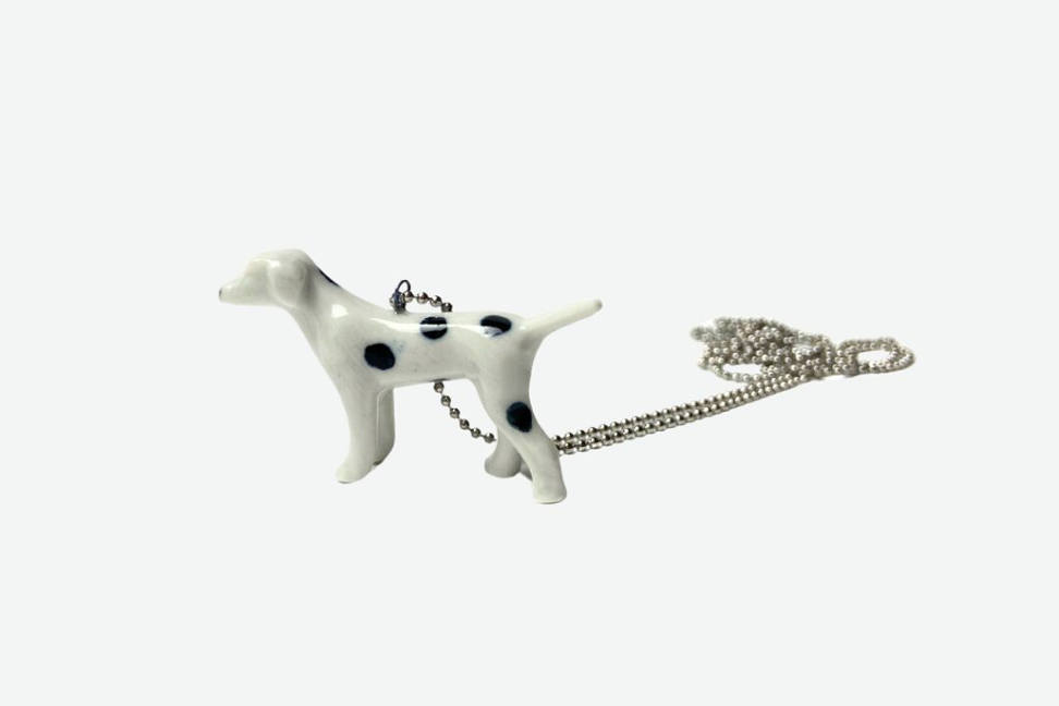Porcelánový náhrdelník pesDalmatín - designový porcelánový šperk ve tvaru pejska. Elegantní a hravý 3D porcelánový zvířecí přívěsek o rozměrech cca 3 x 4 x 2 cm pověšený na dlouhém řetízku. V kombinaci s přívěskem je sladěný ocelový kuličkový řetízek v zlaté, stříbrné nebo černé barvě. Porcelán dekorovaný zlatem nebo platinou. Naglazurová zlatá barva obsahuje 24-karátové zlato. Jediný originál. Psí řetízek, který vypráví příběh – o lásce, věrnosti a přátelství.