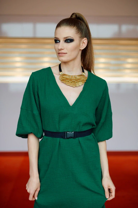 Letní designové šaty z dvojité gázoviny zvané mušelín s nabíranými rukávy. Hluboký véčkový výstřih, délka nad kolena. Pásek s přezkou je volně přiložen a je součástí modelu. Jsou elegantní, dominantní, sebevědomé a svůdné. Příjemný materiál umožňuje pohodlné nošení na celý den i na večírek nebo romantickou večeři.