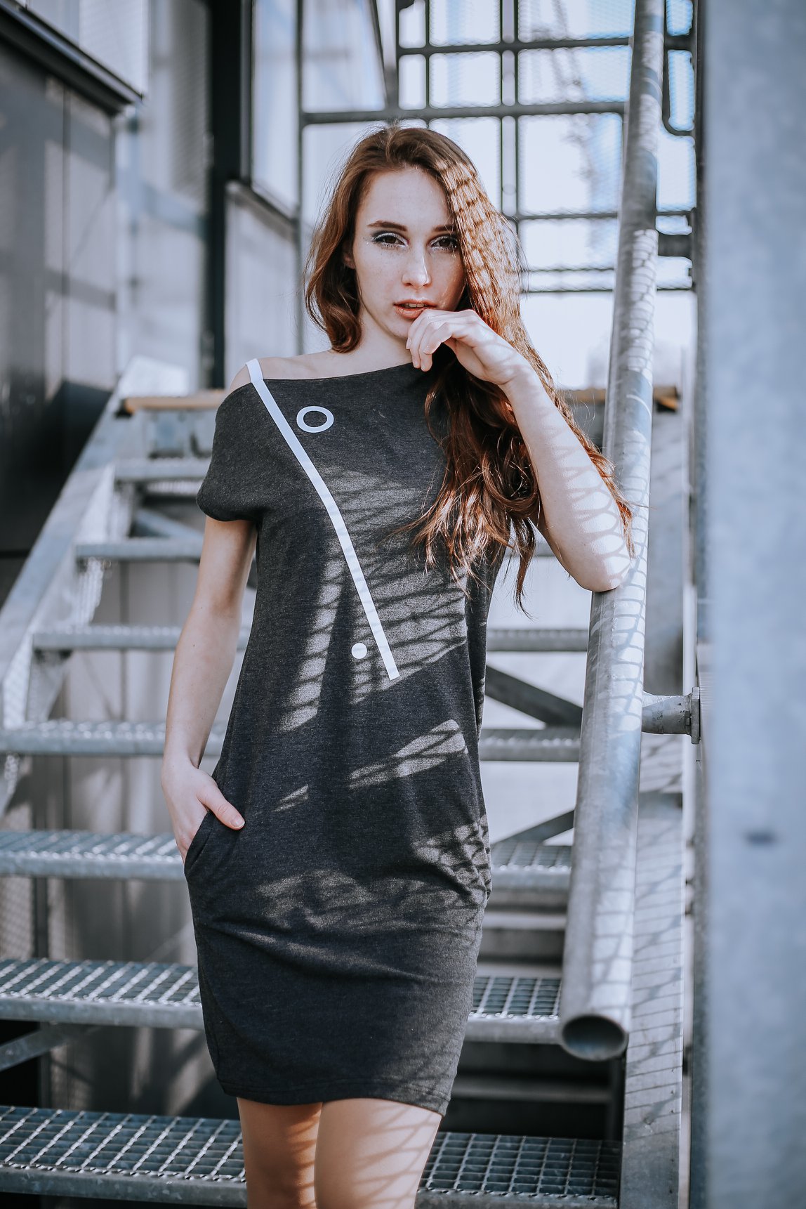 Designové originální geometrické šaty s příjemného pružného úpletu, v podsádce je vsazena pružná šnůrka, která prodlužuje potisk linky v důmyslné ramínko, kapsy a koženkové logo v bočním švu.