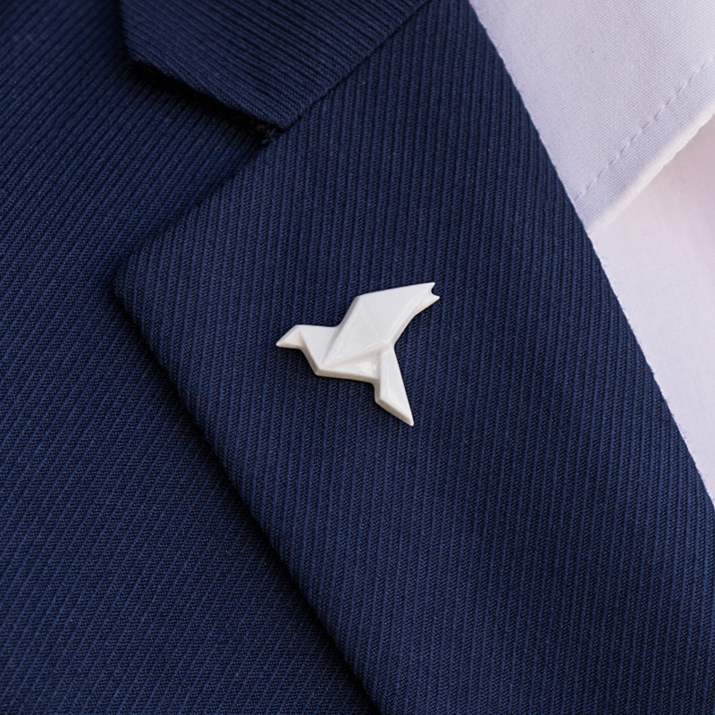 Bílá porcelánová ozdoba do klopy HOLUBICE - originální designový porcelánový šperk ve tvaru holubice o rozměru 2,2 x 1,8 cm inspirovaný origami, japonským uměním skládání papíru. Origami je staré japonské umění skládání papíru. Porcelart je nové české umění skládání porcelánu. Originální ručně vyráběné české porcelánové šperky inspirované japonským uměním skládání papíru. Orikata. Orisue.