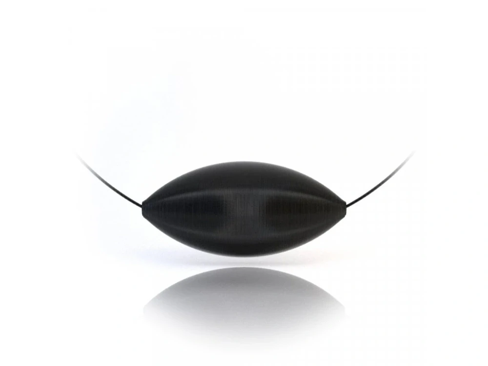 Černý geometrický designový objekt zavěšený na ocelovém potaženém lanku. Tvar náhrdelníku je inspirován vzducholodí. Řadíme jej proto do kolekce mraků. Velikost vzducholodě je cca 67 x 32 x 22 mm, délka lanka je cca 49 cm. Šroubovací zapínání. 3D tisk - proces vytváření třírozměrných fyzických objektů z digitálního modelu.