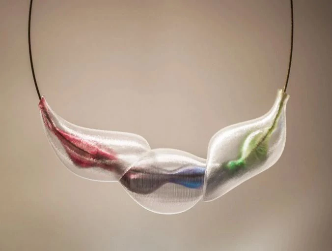 Designový náhrdelník Popuk vzniká 3D tiskem a působí křehce, ale je velmi pevný a lehký. Má hedvábný lesk. Náhrdelník po vytištění barvíme speciálními inkousty do vnitřní dutiny šperku. Jednotlivé barvy se uvnitř mísí a vytváří akvarelový efekt. Barva je do určité míry náhodná, každý kus je svou barevností originální. Velikost šperku je cca 12,5 x 5,8 x 2,7 cm.