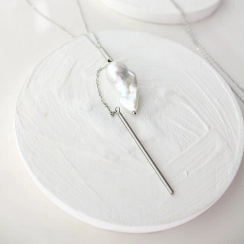 Designový jemně elegantní řetízkový náhrdelník s výraznou barokní říční perlou od yo_soy. Říční perla zavěšená na pevném řetízku z nerezové oceli. Autorský náhrdelník je dlouhý, obvod řetízku je 80 cm, náhrdelník musí jít převléci přes hlavu. Zvlášť visící řetízek má délku 6 cm. Trubičku lze posunout výše ke krku a řetízek tak sevřít do linky, ale nedrží takto úplně napevno. Nerezová ocel nezčerná, nemění barevnost.