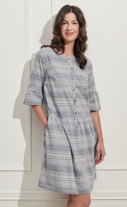 Pohodlné a lehké designové bavlněné šaty v odstínu šedomodré. Délka nad kolena, 92 cm po středu zadního dílu, v oblasti pasu přestřižené, zapínání na légu s knoflíčky, kapsy ve švu na drobnosti. Rukáv je s dekorací volánu a tak tvoří efekt tříčtvrtečních rukávů. Šaty šijeme s volností v pase a pro boky pro maximální pohodlí po celý den.
